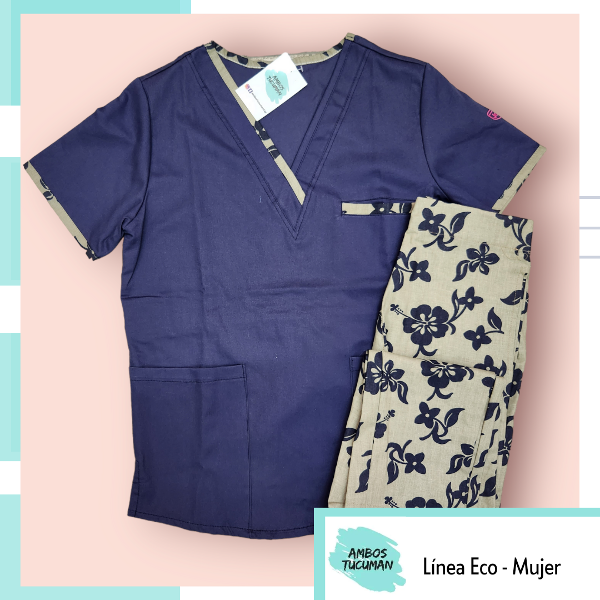 Ambo Azul Pantalon Flores Negras Fondo Beige