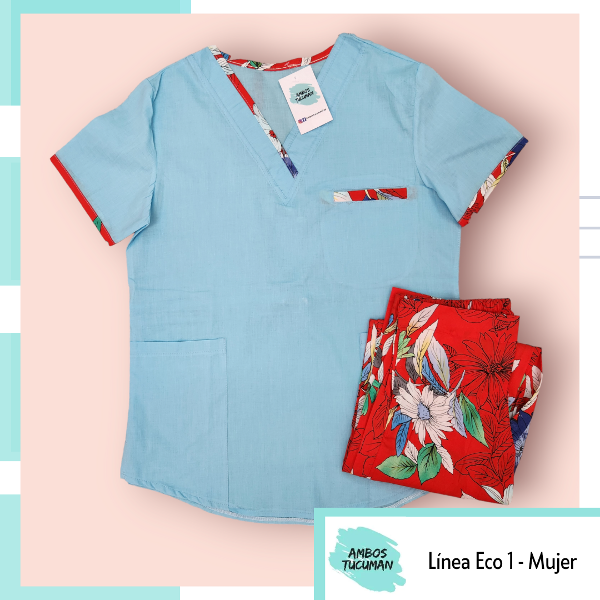 Ambo Celeste Clarito Pantalon Flor Fondo rojo